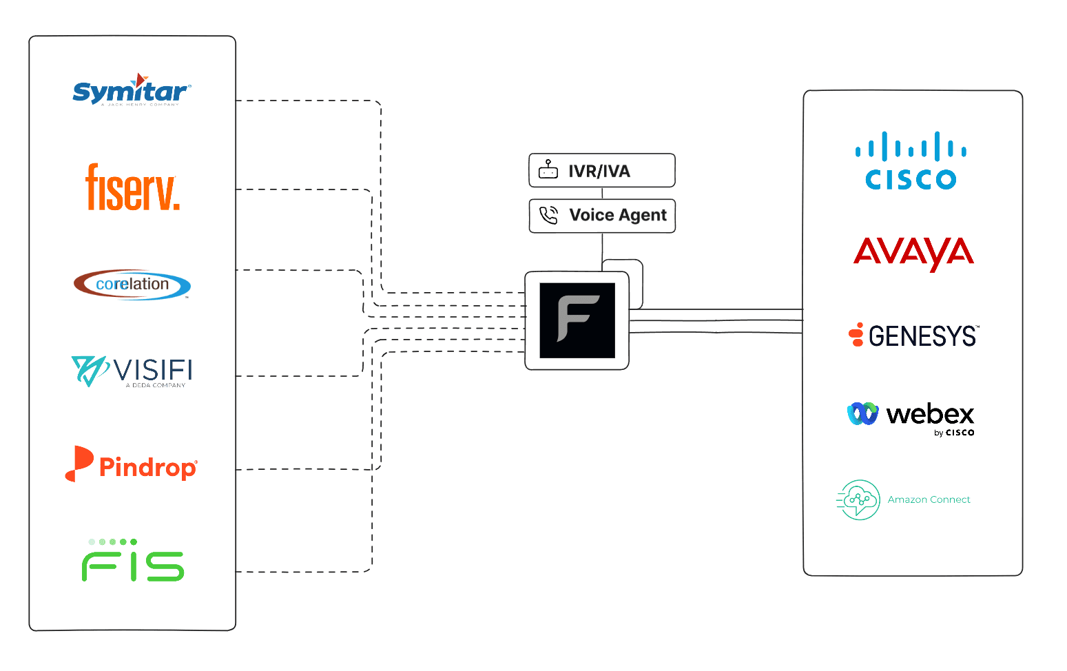 100+ connectors: core banking, CRM, payments, ticketing, knowledge bases, CCaaS/UC, and more.
